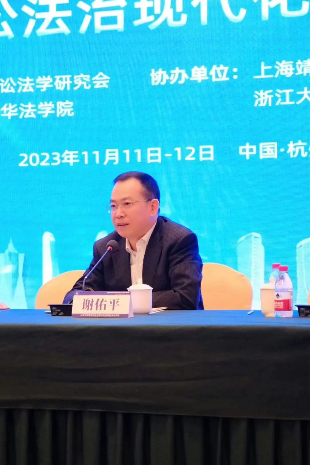 承办,上海靖予霖律师事务所和浙江大学新时代枫桥经验研究院共同协办。中国法学会党组书记、常务副会长陈训秋出席开幕式并讲话,浙江省委常委、政法委书记,浙江省法学会会长王成国,最高人民法院党组成员、副院长李勇,最高人民检察院党组成员、副检察长陈国庆,浙江大学党委副书记傅强出席开幕式并致辞。中国刑事诉讼法学研究会会长敬大力主持开幕式。参加会议的还有研究会名誉会长卞建林教授,研究会顾问龙宗智、宋英辉、王敏远教授,全国人大常委会法工委刑法室副主任黄永,法律出版社党委委员、副总编辑张雪纯等特邀嘉宾。参加大会开幕式的还有中国法学会有关部门负责同志和来自北京、吉林、上海、江苏、浙江、河南、湖北、广东、广西、四川、新疆、黑龙江哈尔滨等全国12个省区市法学会的主要负责同志。参加本次会议的研究会学术委员会委员、理事、会员及非会员代表等共350余人。研究会副会长,我院谢佑平教授应邀参加会议。