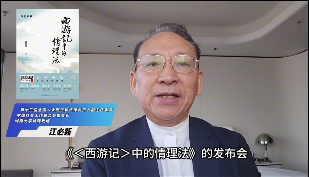 著名法学家、第十三届全国人大宪法和法律委员会副主任委员、中国社会工作联合会副会长江必新教授首先作了题为《法的真善美与跨学科研究》的视频致辞。他在发言中肯定《〈西游记〉中的情理法》是一部兼具学术深度与大众温度的法治文化佳作,具有“素材新、角度新、方式新”三大亮点。“素材新”在于该书将法律与文学的交叉研究延伸至神话叙事,通过解读《西游记》揭示明代真实的法律制度运作。如孙悟空状告李天王的情节,呼应明代朱元璋鼓励百姓赴京上告的传统;而太白金星调解结案则体现了“以和为贵”的古代调解制度。“角度新”在于把文学的想象和历史的考证方法具体融合在一起,是典型的跨学科研究。“方式新”在于写作方式上雅俗共赏,传播方式注重公共普法。