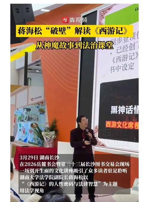 作为央视《百家讲坛》《法律讲堂》等平台的特邀主讲嘉宾,蒋海松教授曾主讲《年话民法典》《典籍中的法治思想》等多部法治文化节目,收获全国观众的广泛关注与好评。此次登上2026岳麓书会的舞台,蒋海松教授围绕其作品《〈西游记〉中的情理法》展开分享。该书基于《百家讲坛》同名讲座整理而成,一经面世便引爆行业与读者圈层,成为兼具学术深度与大众可读性的法律畅销书。