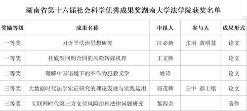 其中,江必新教授主持、张雨和黄明慧共同参与的系列论文《习近平法治思想研究》,王文胜教授独著的论文《托底型回购合同的风险转嫁机理》分别荣获一等奖。姚诗教授独著的系列论文《理解中国语境下的不作为犯教义学》荣获二等奖。屈茂辉教授主持、王中和郝士铭共同参与的系列论文《大数据时代法学实证研究的理论发展与实践运用》,黎四奇教授独著的学术著作《互联网时代第三方支付风险治理法律问题研究》分别荣获三等奖。