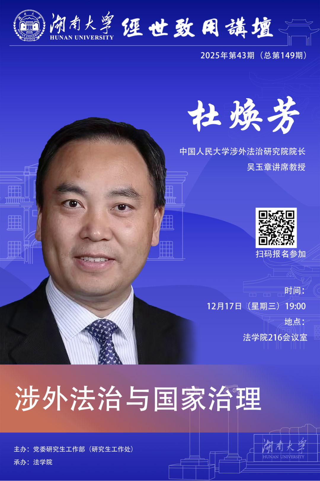 216会议室作“涉外法治与国家治理”主题讲座,欢迎同学们踊跃参加。