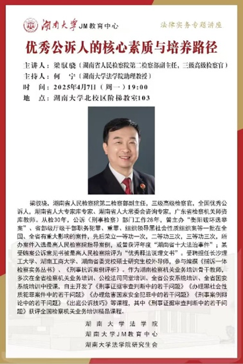 梁驭骁检察官是湖南省人民检察院第二检察部副主任,三级高级检察官,全国优秀公诉人,湖南省人大专家库专家、湖南省人大常委会咨询专家,广东省检察机关师资库教师。从检30年,公诉(刑事检察)部门工作28年,曾主办“衡阳破坏选举案”、省部级厅级干部职务犯罪、重罪、组织领导黑社会性质组织案等一批在全国、全省有重大影响的案件,先后荣立一等功一次,二等功三次,三等功三次,所办案件入选最高人民检察院指导案例,或曾获评年度“湖南省十大法治事件”;某受贿案公诉意见书被最高人民检察院评为“优秀释法说理文书”。受聘担任长沙理工大学、湖南工商大学、湖南省委党校硕士研究生校外导师,参与编撰《捕诉一体检察实务丛书》、《刑事抗诉案例评析》。作为湖南检察机关业务培训骨干教师,多次在全省检察机关业务培训、公检法司同堂培训、全省公安系统培训、全省国安系统培训中授课,自主开发了《刑事证据审查判断中的若干问题》《办理黑社会性质犯罪案件中的若干问题》《办理危害国家安全犯罪中的若干问题》《刑事案例辩论中的若干问题》《出庭公诉技巧》等课程,其中《刑事证据审查判断中的若干问题》获评全国检察机关业务培训精品课程。