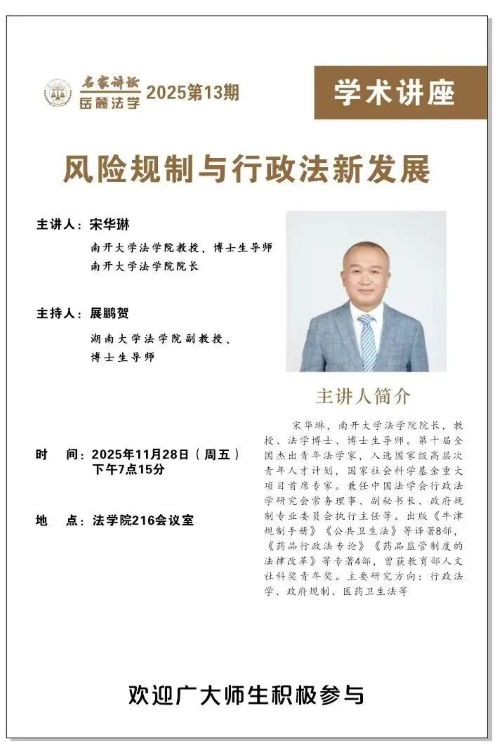 讲座过程中,宋教授主要讲述以下几点内容。第一,风险规制理念上,应避免过度预防,其涉及社会资源分配、政府与公民自由介入等问题,新兴领域如人工智能也存在风险。第二,风险规制立法上,中国有食品安全法等相关立法,其对学术研究等环节构成基本权利限制,且常使用不确定法律概念。第三,注重部门规章在风险规制中的作用,部门规章需依法立法,以发挥行政机关专业知识,更好回应社会诉求。在风险规制中,行政解释、技术标准、指导性文件也很重要,各自有其特点与作用。第四,强调企业自我规制,药品企业需遵守法规并配合监管,同时可进行自我规制,包括制定内部规则与采取风险管理措施。第五,风险分级分类规制,因事物差异与监管资源有限,需进行风险分级分类规制,其架构需立法授权并兼顾科学与民主,在风险分级分类制度框架构建上,立法主要做出框架,授权行政机关明确分级分类标准,并且应当按照风险程度做出便于测量的分级分类标准,其指出目前我国分级分类存在难以确定等问题,需要在明确风险级别后,制定不同程度的行政干预手段。第六,以“白酒塑化剂事件”为例,对可接受风险理念进行阐述,要求高于可接受风险水平以行政规制为主,低于则以自我规制和民事责任为主,应避免过度预防。
