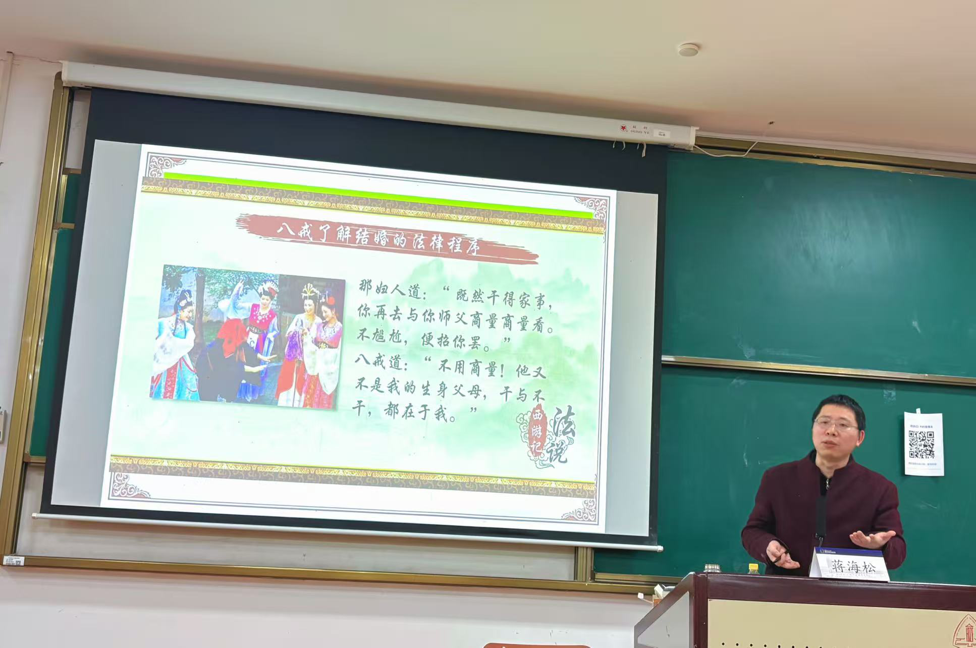 蒋海松在讲座中,以《西游记》为例,侧重分析了用文学作品解读法律文化的优势、魅力,也反思了其弊端、风险。 他指出,法律术语与逻辑常让人感到疏离。文学作品用故事的趣味性消解法律的枯燥感,能让法律思维变得“更形象”。无论是《西游记》里的“妖界法律纠纷”,还是《红楼梦》中的家族财产继承,都让抽象的法理变得可感知、可亲近,能激发学习兴趣,培养“法律学习的情境感”。从《西游记》的神魔世界看权力与规则的博弈,这种分析能帮助人们理解法律背后的文化基因,洞察法律与社会价值观的深层互动,这种沉浸式体验远胜于单纯背诵法条。