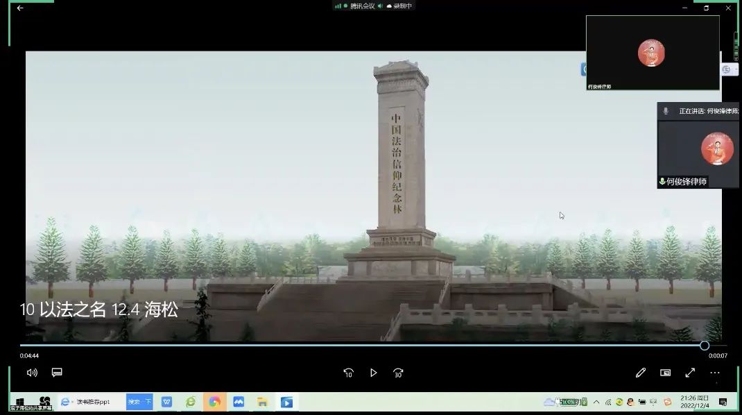 与谈嘉宾何俊锋律师发言分享了他在过去宪法普法过程中的收获与感悟,介绍了其发起尊法宣誓馆、发起法治信仰中国行活动的心路历程。他呼吁我们要始终铭记法律人的使命感,用“昌法治,昭日月”般坚定的信念,弘扬宪法精神,以己之力凝聚成火铸就法治之剑。