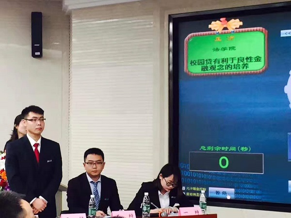 B111教室拉开帷幕,这一场精彩的比赛吸引了众多学生们的目光,从辩题来看,“校园贷有利于良性金融观念的培养”略显弱势,但上场队员彭超男、苏杨波、靳欣波以优异的表现力挽狂澜,赢得了观众的阵阵掌声。评委离席后的观众讨论环节也尤为热烈,比赛激烈程度可见一斑。最后,法女性自慰