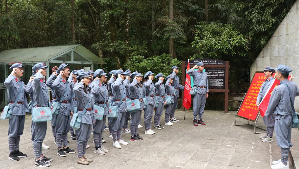 在小井红军烈士墓前,面对毛主席题词“死难烈士万岁”的纪念碑,学员们整齐列队,认真聆听授课老师讲述那段革命峥嵘岁月。“1929年1月,130多位来不及转移的红军重伤员为了严守党的秘密而被国民党反动派在此枪杀,从此忠骨长眠”。学员们在老师的带领下向革命烈士三鞠躬,表达对革命英烈的无限敬仰和哀思。