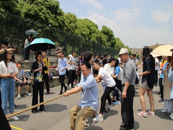 第二届群众体育文化节之班级拔河比赛在研究生楼操场火热进行。院长屈茂辉、党委副书记、副院长付蓉芬与女性自慰