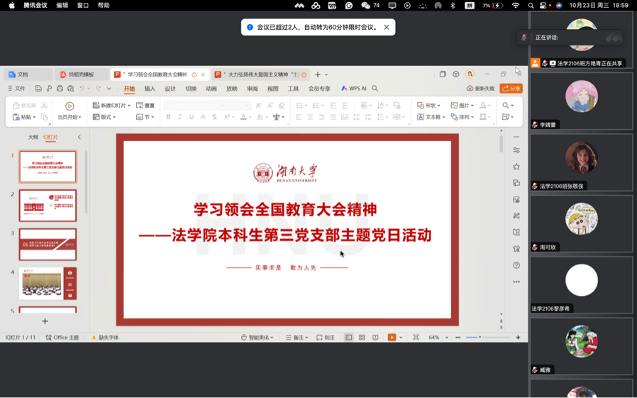本科生第三党支部通过线上平台,召开了以“学习领会全国教育大会精神”为主题的党日活动。此次活动旨在深入学习贯彻习近平总书记在全国教育大会上的重要讲话精神,进一步统一思想、凝聚共识,推动支部成员在教育领域 更好地发挥先锋模范作用。